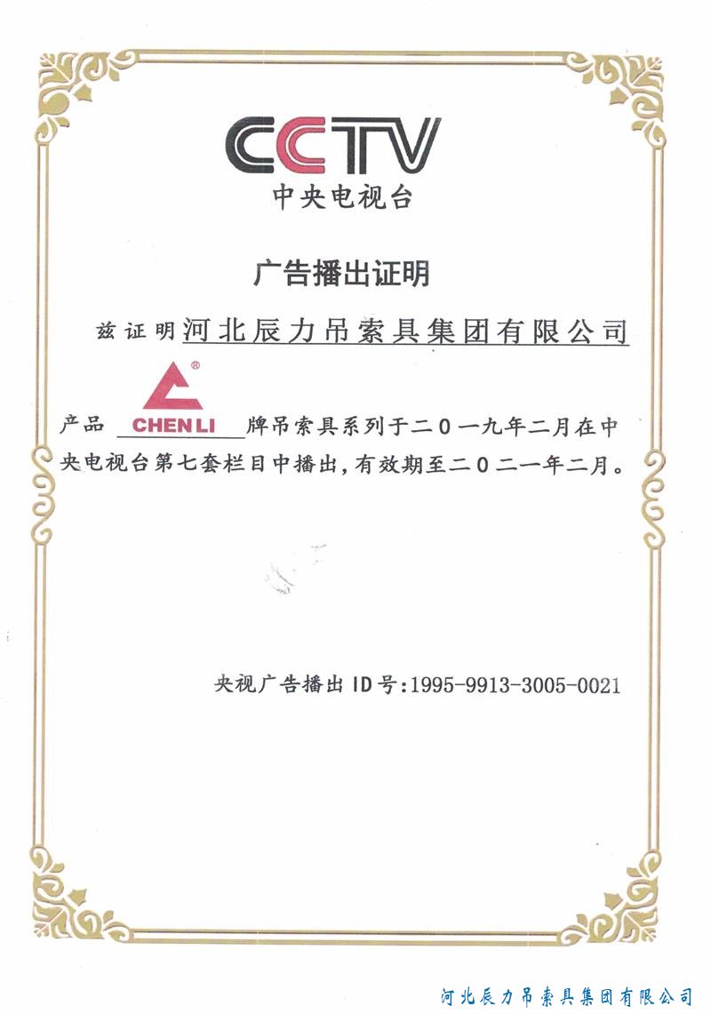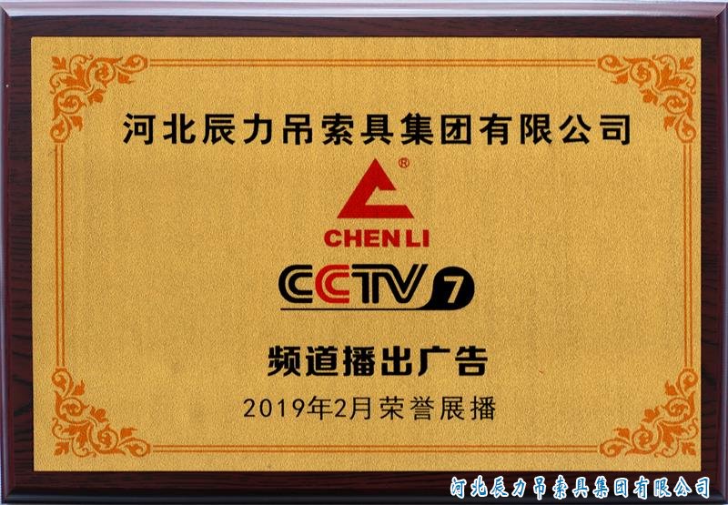 專注品質,誠信為本,辰力吊索具。 辰力牌吊索具系列于2019年2月在***電視臺第七套欄目播出,有效期2021年2月。